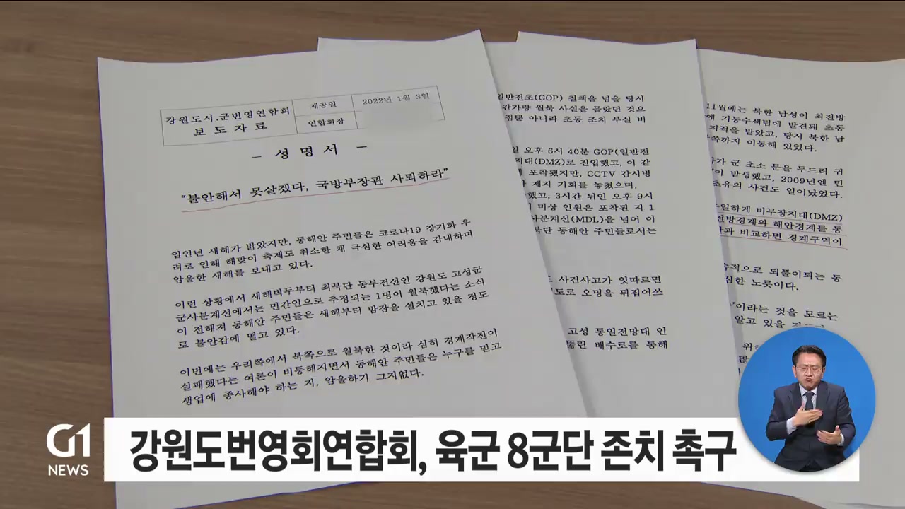 강원도시군번영회연합회는 성명을 내고 "새해 첫날 민간인 추정 1명이 월북해 주민들이 불안에 떨고 있다"며, 튼튼한 국방을 위해 해체 예정인 8군단을 존치하라고 촉구했습니다.