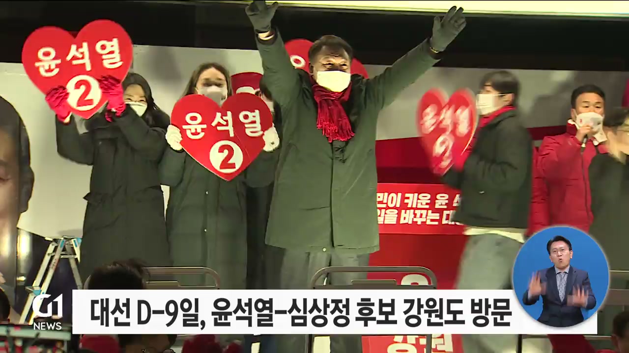 제20대 대통령 선거가 9일 앞으로 다가온 가운데, 국민의힘 윤석열·정의당 심상정 대선 후보가 오늘 강원도를 찾아 표심 공략에 나섭니다.
