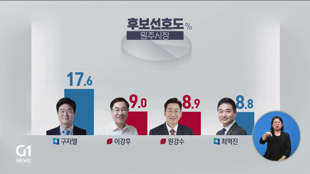 이강후 전 국회의원 9%, 원강수 전 강원도의원 8.9%, 최혁진 전 청와대 경제수석실 비서관이 8.8%로, 구 전 실장이 오차범위 밖에서 앞선 가운데 3명의 후보가 추격하는 양상입니다./