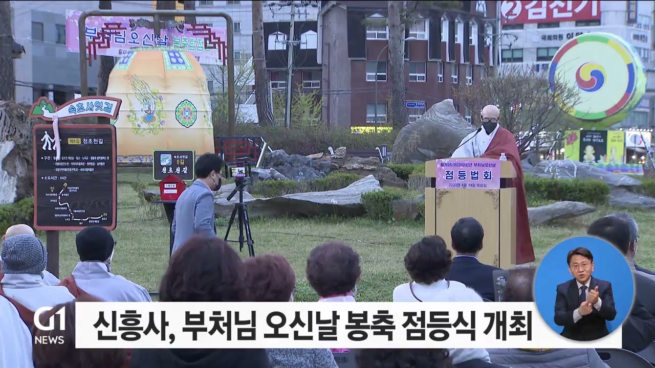 설악산 신흥사가 어제(14일) 저녁 옛 속초소방서 앞 잔디광장에서 불기 2566년 부처님 오신날 봉축 점등식을 열었습니다.