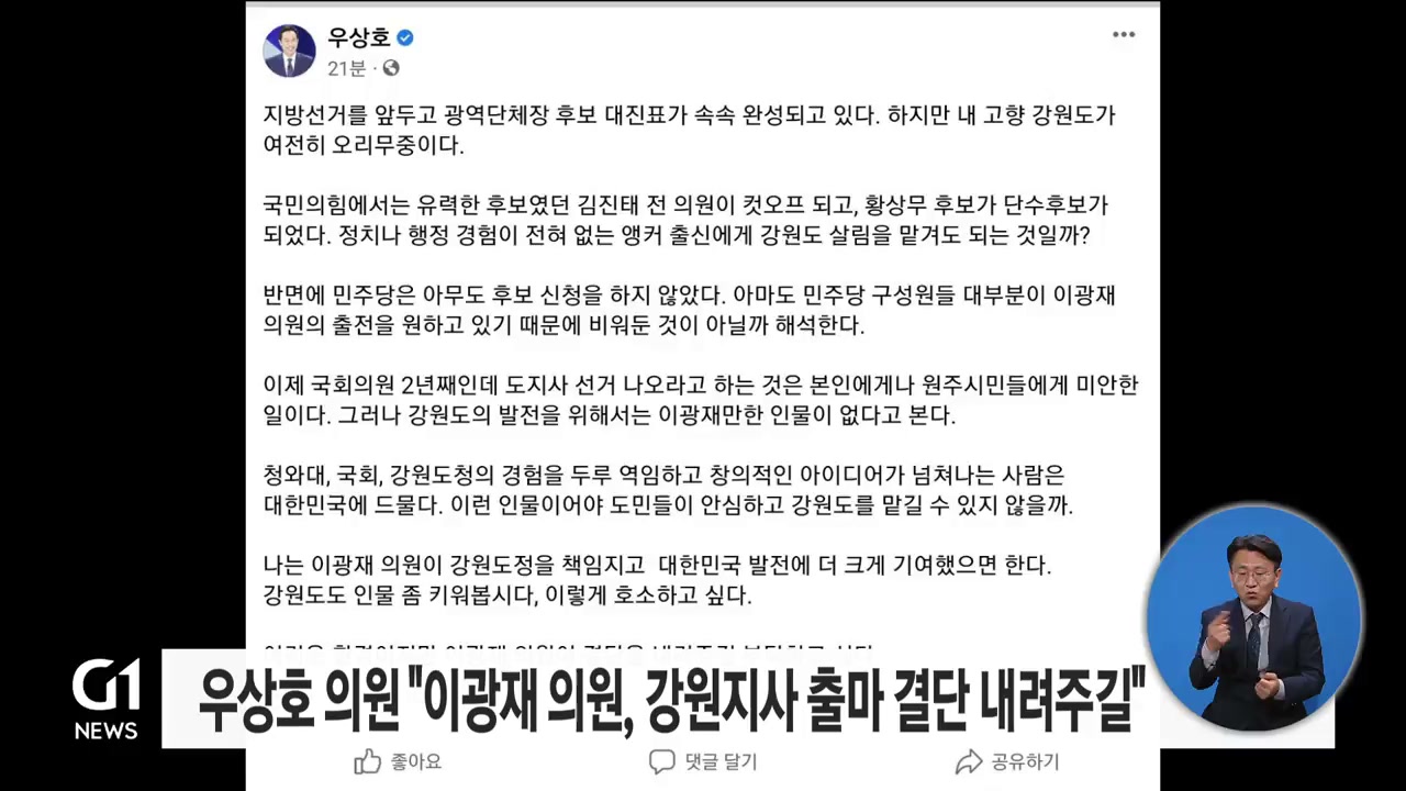 우 의원은 본인의 SNS에서 "지선을 앞두고 광역단체장 후보 대진표가 속속 완성되고 있지만 고향 강원도가 여전히 오리무중"이라며 이같이 밝혔습니다.