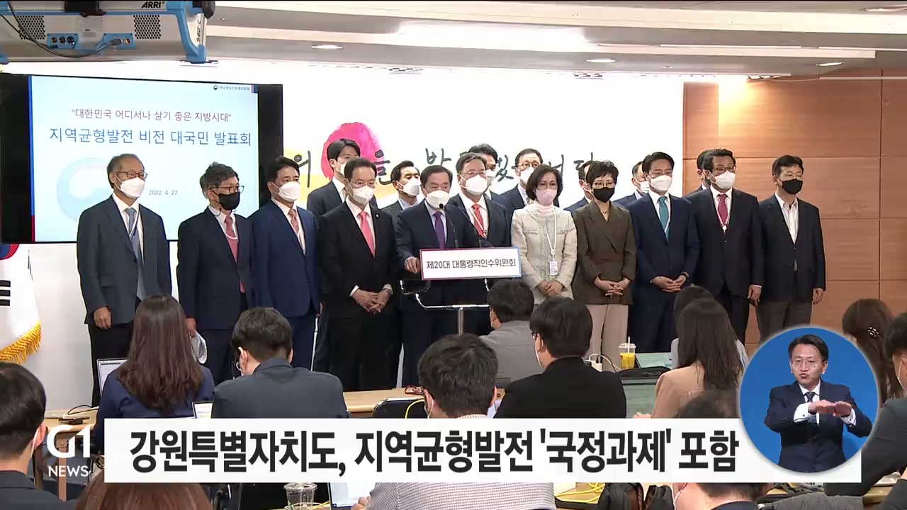 윤석열 대통령 당선인의 강원도 제1 공약인 강원특별자치도 설치가 새 정부의 지역균형발전 국정과제에 포함됐습니다.