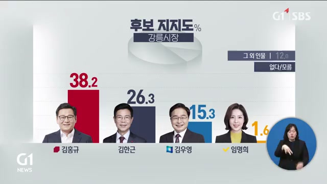 강릉시장 선거는 국민의힘 김홍규 후보를 현 강릉시장인 무소속 김한근 후보가 뒤쫓고 있는 것으로 나타났습니다.