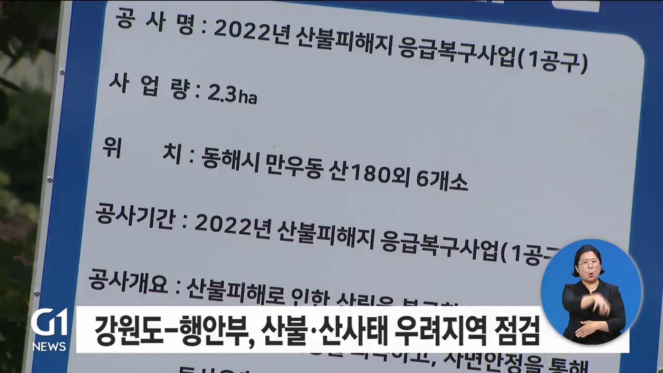 주요 점검 현장은 동해시 만우동 산불피해지 응급복구 사업장과 삼척시 가곡면 오저 2지구 급경사지 붕괴위험지역 정비사업장 등 입니다.