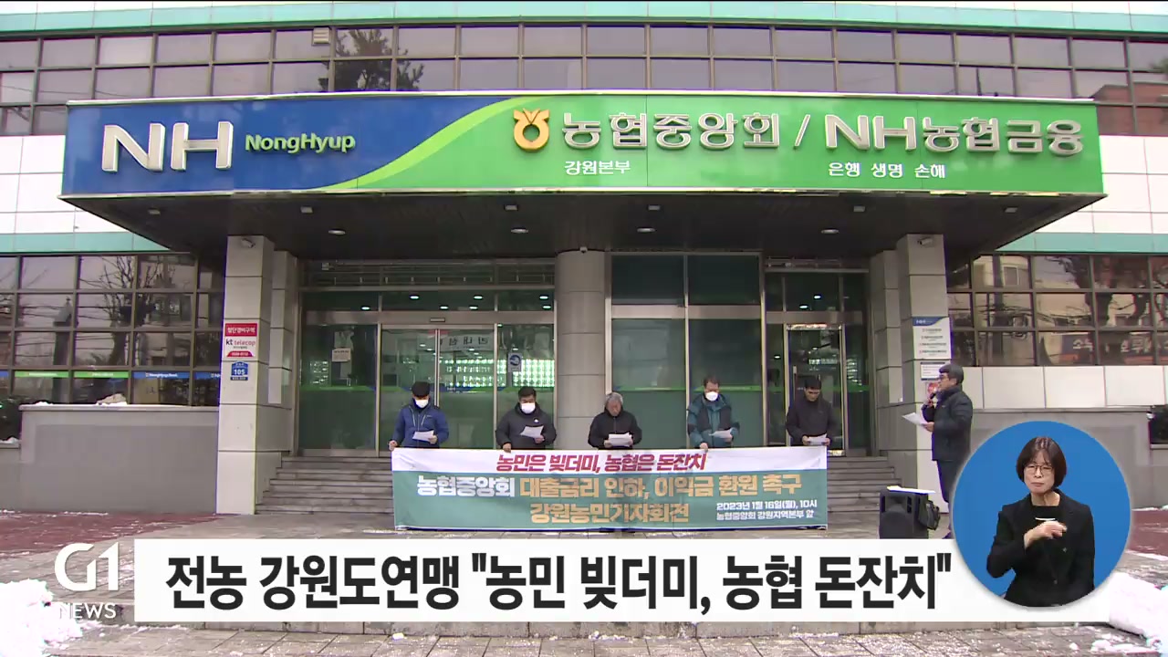 전국농민회총연맹 강원도연맹이 어제(16일) 농협중앙회의 대출 금리 인하와 이익금 환원을 촉구하는 기자회견을 열었습니다.