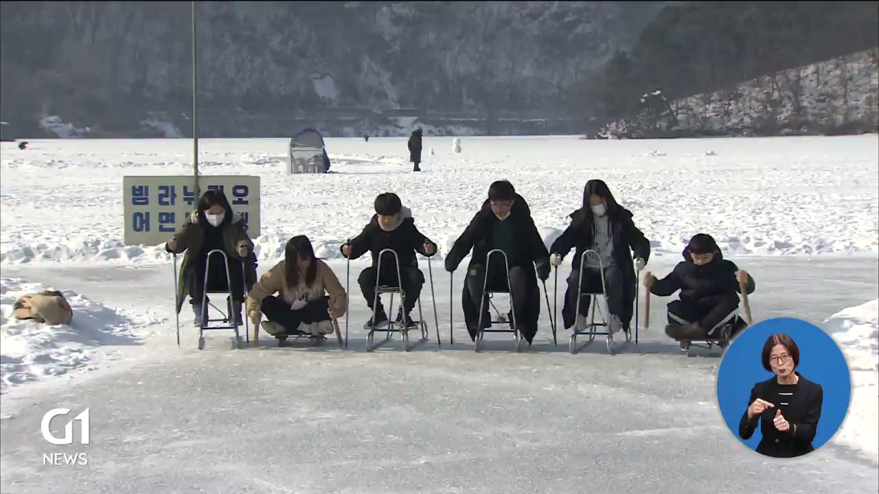 꽁꽁 얼어붙은 강에서 얼음 썰매를 즐기는 아이들.