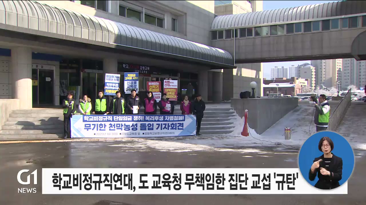 강원학교비정규직연대회의가 도교육청 앞에서 강원도교육청의 무책임한 교섭을 규탄하는 기자회견을 열었습니다.
