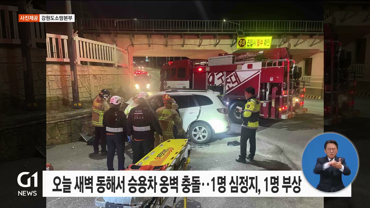 동해서 승용차 옹벽 충돌..1명 심정지, 1명 부상