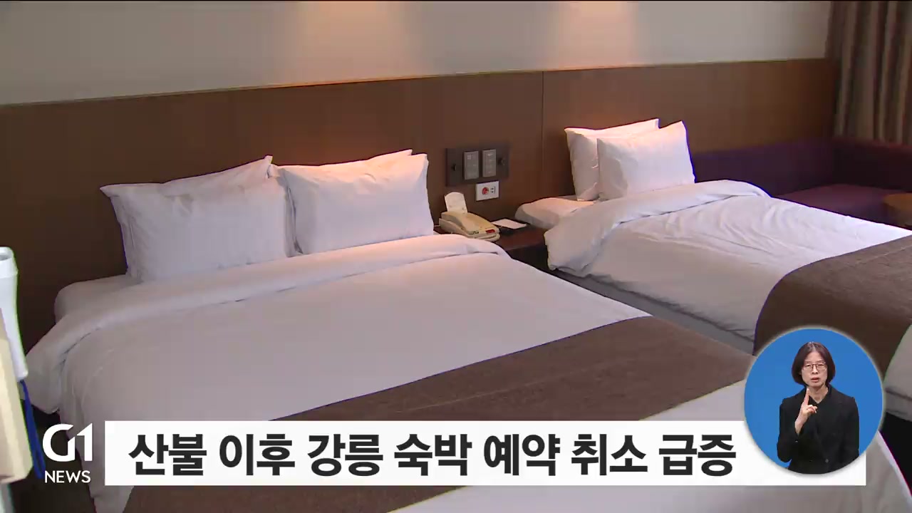 강릉 숙박업계에 따르면, 산불이 난 지난 11일 이후 대형 호텔 객실 예약률이 평소보다 20% 가량 떨어지고, 예약 취소도 빗발치고 있습니다.