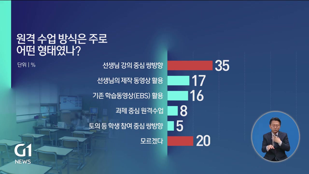 G1방송은 강원도 최초로 도교육청과 함께 2년 넘게 진행된 원격 수업의 만족도와 문제점을 알아보기 위한 설문조사를 실시했습니다.