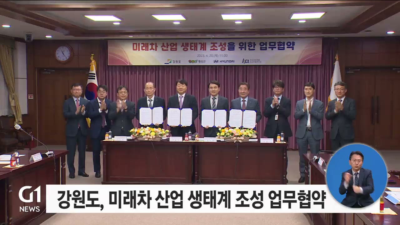 강원도와 횡성군, 현대자동차, 한국건설생활시험연구원이 미래차 산업 생태계 조성을 위한 업무협약을 체결했습니다.