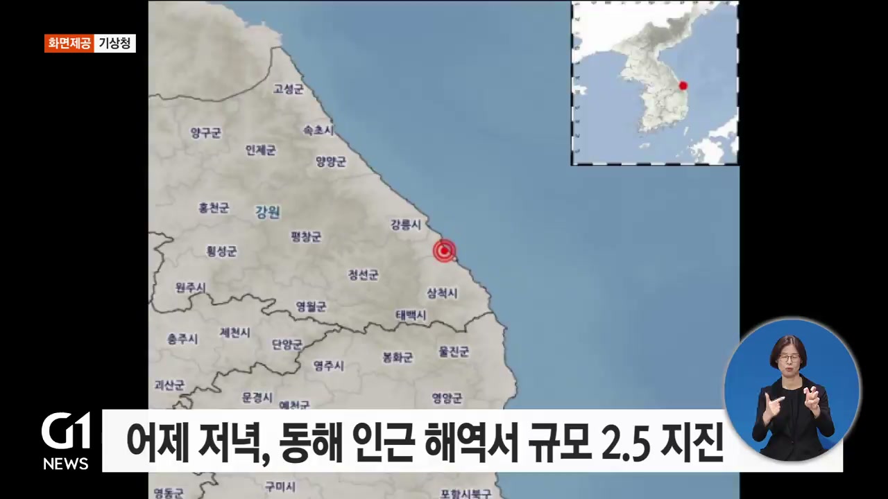 어제(8일) 오후 7시 51분쯤 동해시 남남동쪽 4km 해역에서 규모 2.5 지진이 발생했습니다.