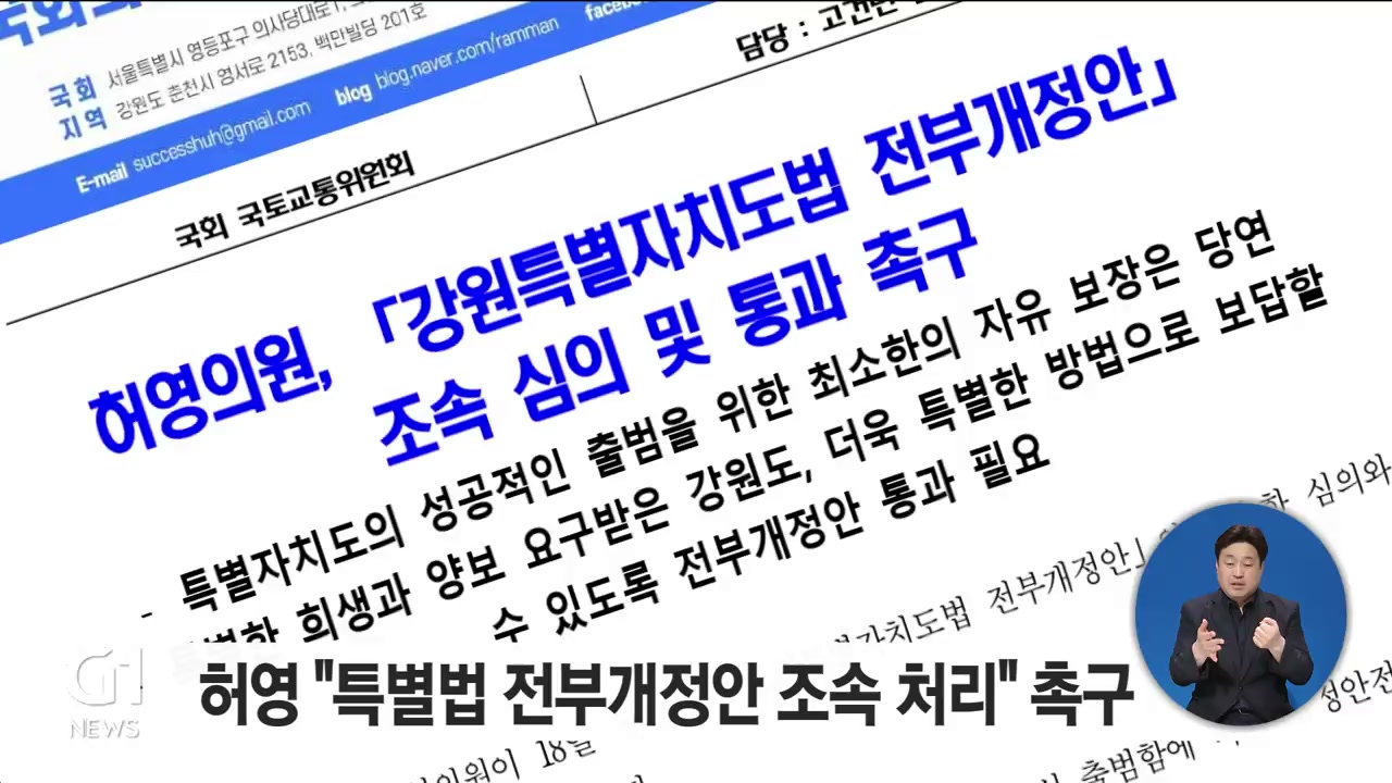 더불어민주당 허영 국회의원이 강원특별자치도법 전부개정안의 조속한 국회 심의와 본회의 통과를 촉구했습니다.