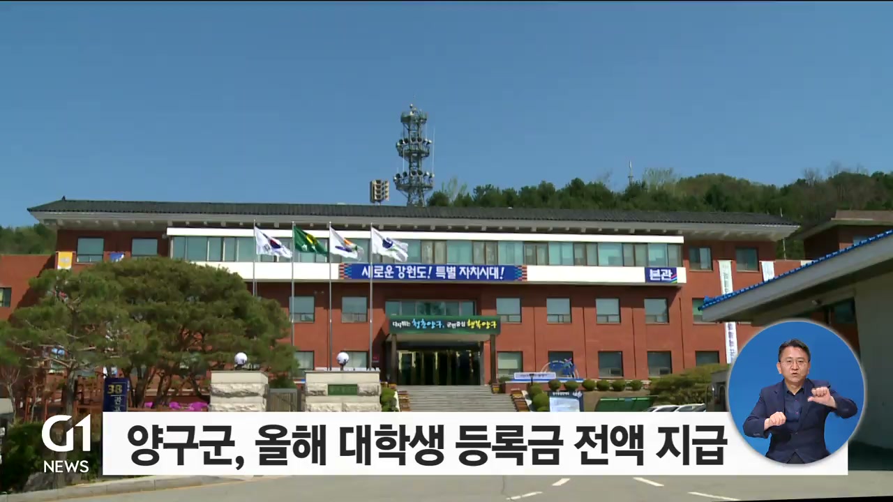 양구군은 지역에 주소를 둔 대학교 재학생 256명에게 5억5,100만 원의 등록금 전액 지급을 완료했다고 밝혔습니다.