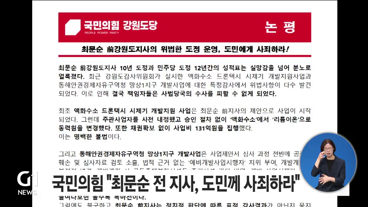 국민의힘 강원도당이 논평을 내고 최문순 전 강원도지사를 향해 "도민에게 사죄하라"고 촉구했습니다.
