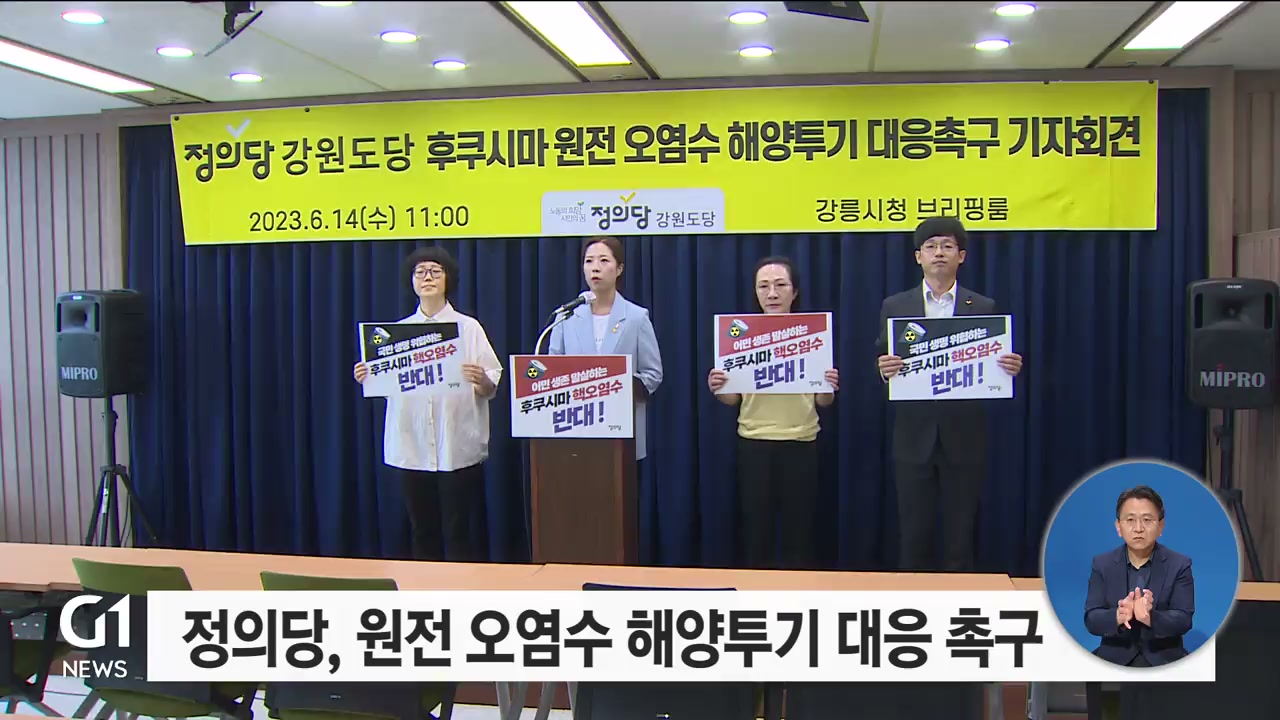 정의당 강원특별자치도당은 강릉시청에서 기자회견을 열고, 일본의 오염수 방류로 인한 피해가 자명한 상황인 만큼 강원특별자치도와 도의회 차원의 적극적인 대응이 필요하다고 촉구했습니다.