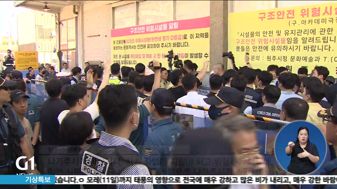 원주시청 공무원들이 옛 아카데미극장 건물 안으로 진입을 시도합니다.