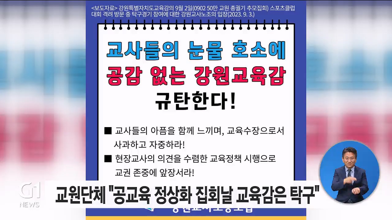 강원교사노조도 "국회 앞에서 교권보호에 대해 촉구하고 있는 상황에서 즐겁게 탁구 치는 교육감의 모습은 매우 유감"이라는 입장을 밝혔습니다.