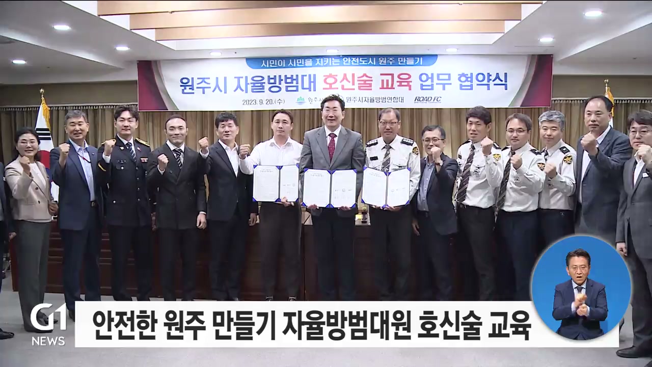 원주시는 어제(20일) 시청 투자상담실에서 '시민이 시민을 지키는 안전한 도시 원주'를 주제로 자율방범대와 종합격투기 단체인 로드FC 간 업무 협약을 맺었습니다.