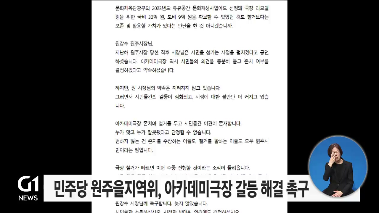 더불어민주당 원주을 지역위원회가 어제(11일) 성명서를 내고 아카데미극장 갈등 해결을 촉구했습니다.