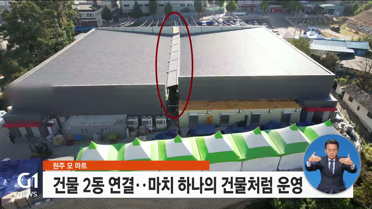"당초 해당 마트 측이 건축법을 피하기 위해 천㎡ 이하의 건물 2동을 짓고, 준공 이후에 연결 통로를 만들어 사용하는 등 편법을 한 것 아니냐는 의혹이 제기되고 있습니다."