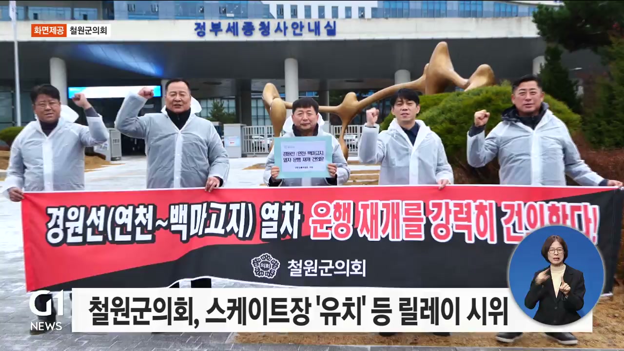 철원군의회 의원들이 정부세종청사를 찾아 국제스케이트장 철원 유치와 연천에서 백마고지역 구간 경원선 열차의 운행 재개를 촉구하는 1인 릴레이 시위를 벌였습니다.