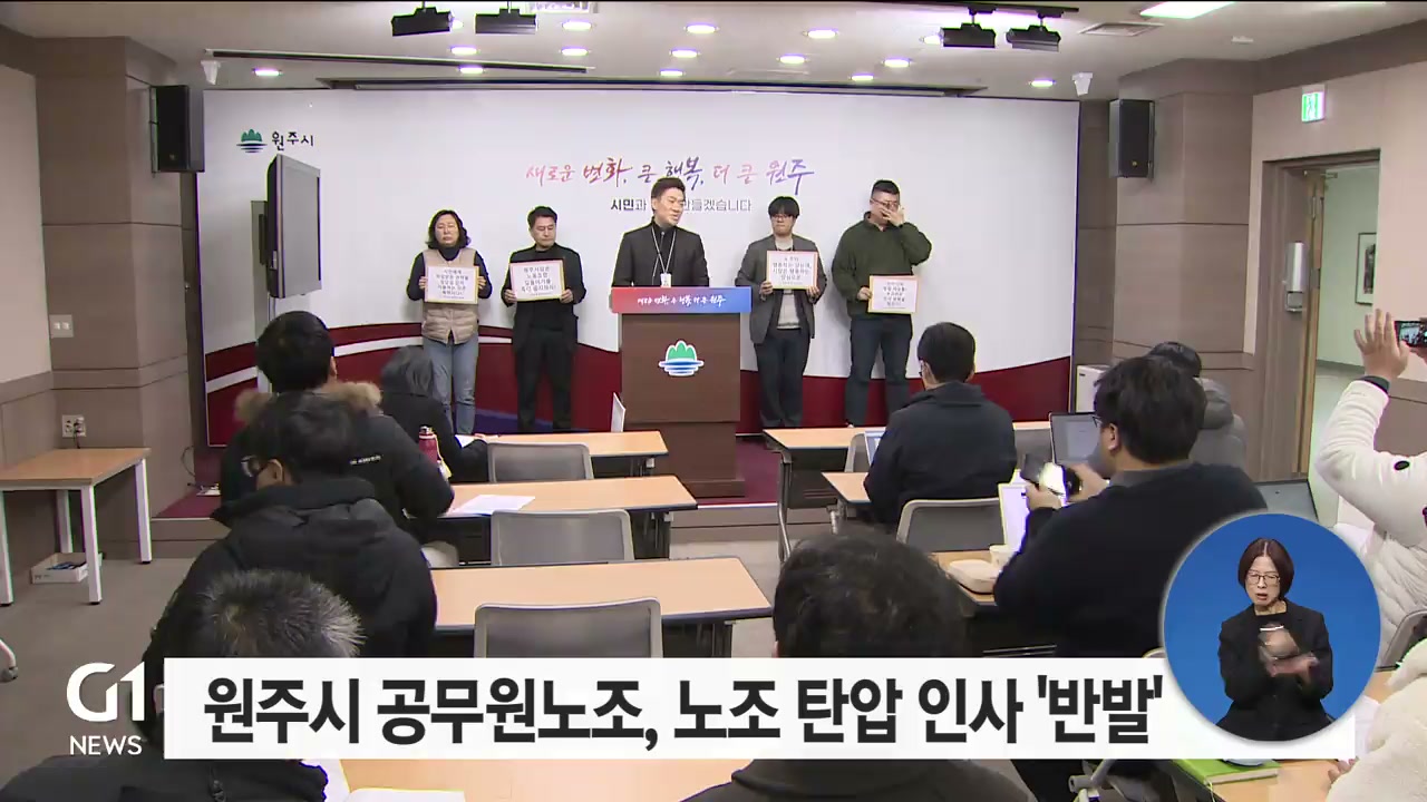 원주시청 공무원노동조합이 어제(8일) 원주시청 브리핑룸에서 원주시장 노조탄압 저지를 위한 기자회견을 열었습니다.