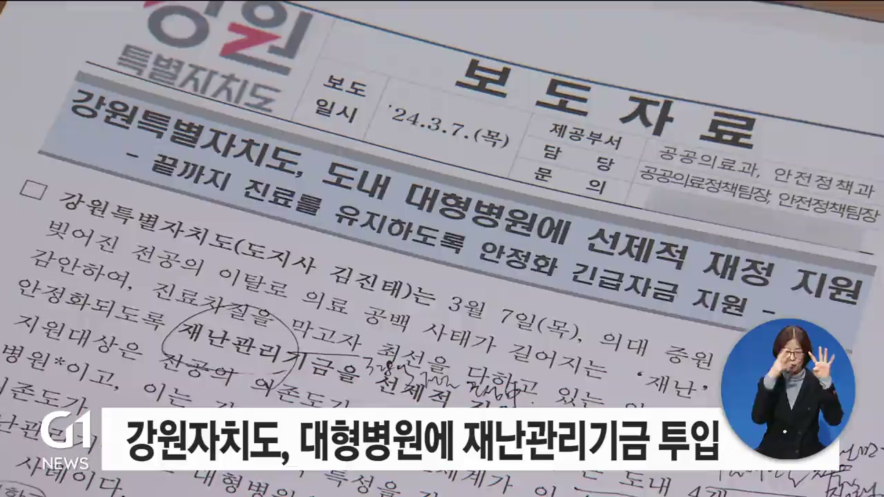 전공의 이탈 사태가 장기화 되면서, 강원자치도가 도내 대형 병원에 재난관리기금 8억 원을 지원하기로 했습니다.