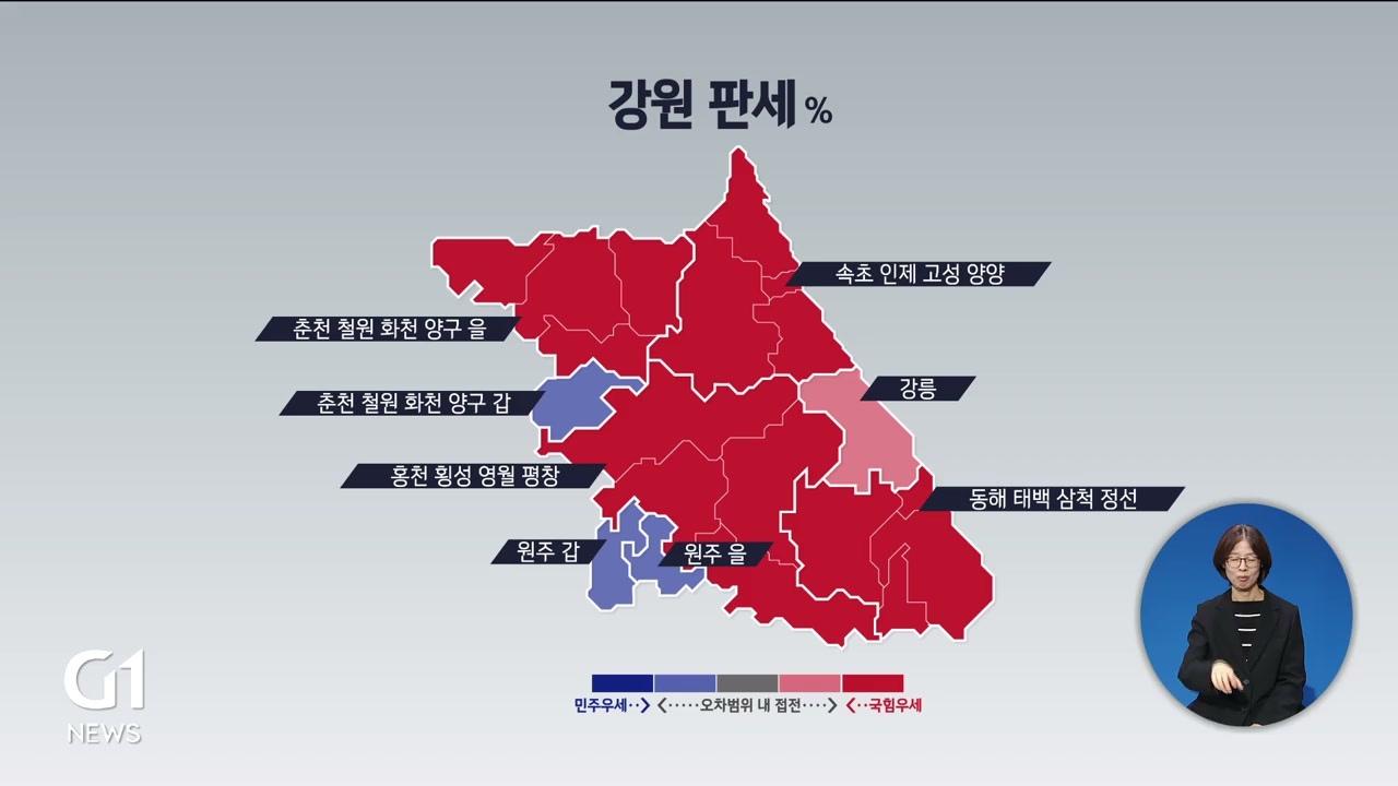 춘천 갑, 원주 갑/을, 강릉 네곳은 국민의힘과 민주당 후보의 지지율이 오차 범위 안에 들어와 있습니다./