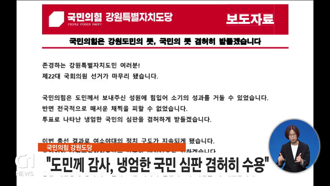 제22대 총선이 마무리된 가운데 더불어민주당과 국민의힘 강원도당이 모두 논평을 내고 "국민의 뜻을 겸허히 받들겠다"고 밝혔습니다.