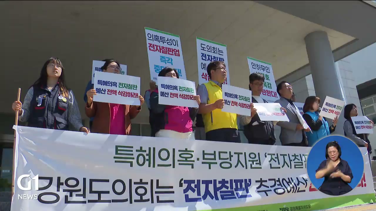 강원자치도교육청이 재추진하고 있는 전자칠판 보급 사업과 관련해, 도내 시민단체가 어제(13일) 도의회 앞에서 기자회견을 열고 예산 전액 삭감을 촉구했습니다.