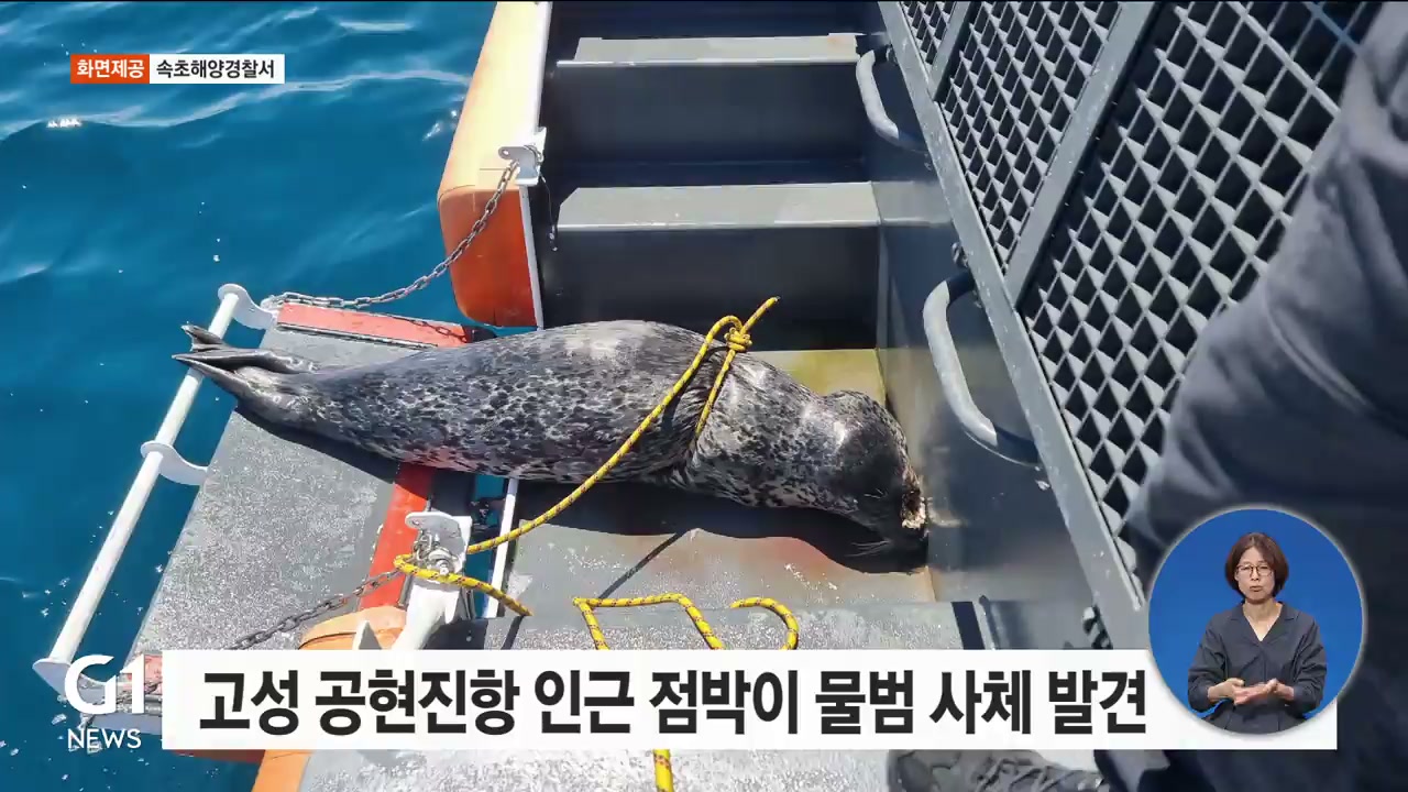 어제(26일) 오전 11시 30분쯤 고성 공현진항 인근 150m 해상에서 점박이 물범이 죽은 채 발견됐습니다.