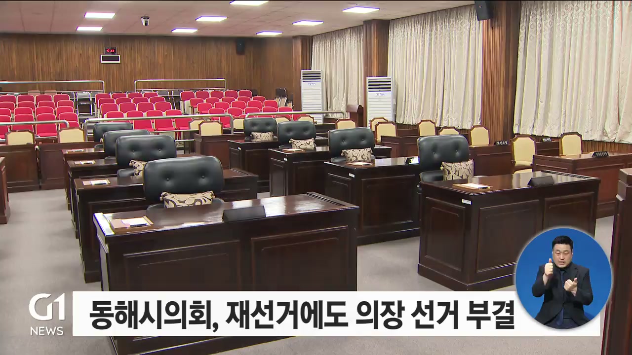 "제9대 동해시의회 후반기 의장 선거 2차투표에서도 출석의원 과반수 득표자가 없으므로 동해시의회 회의규칙 제8조 2항에 의거 결선투표 대상자가 없으므로 결선투표를 실시하지 못합니다."