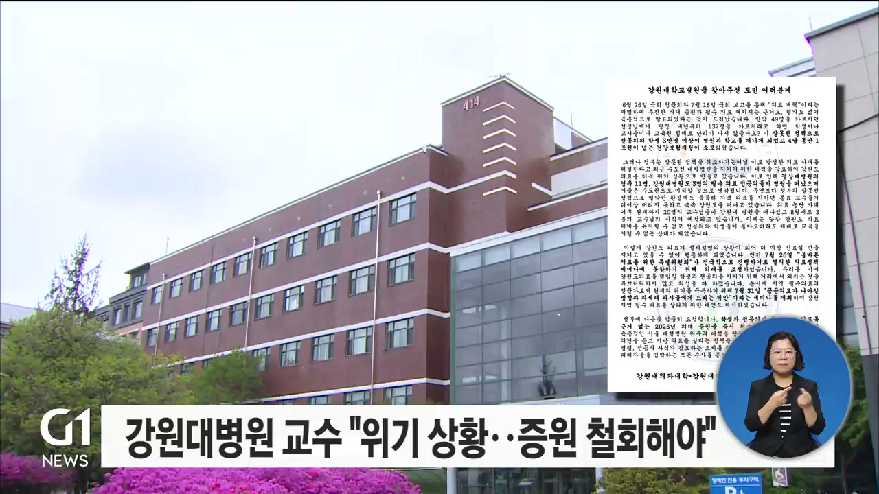 어제(22일)부터 하반기 전공의 모집이 시작된 가운데, 강원대학교 의과대학·강원대병원 교수 비상대책위원회가 정부에 의대 증원 취소를 요구했습니다.