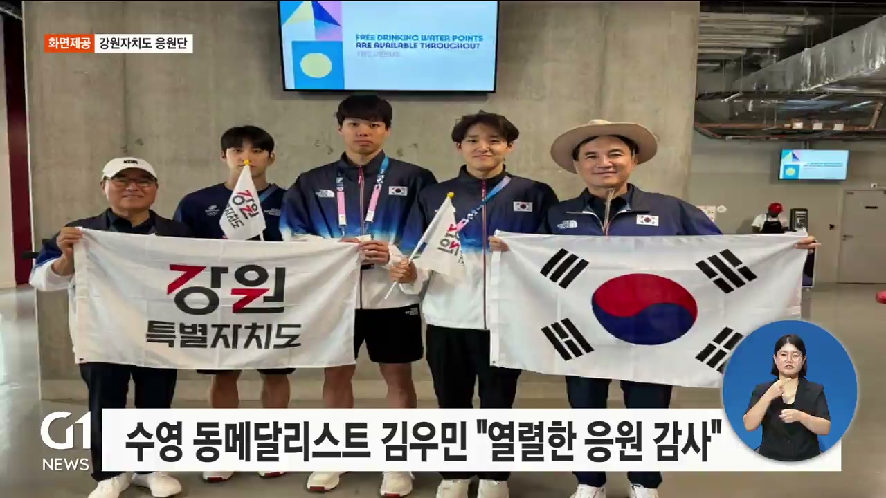 김진태 도지사가 어제(28일) 파리에서 강원도청 소속 수영 국가대표 김우민과 양재훈, 최동열을 만나 격려했습니다.