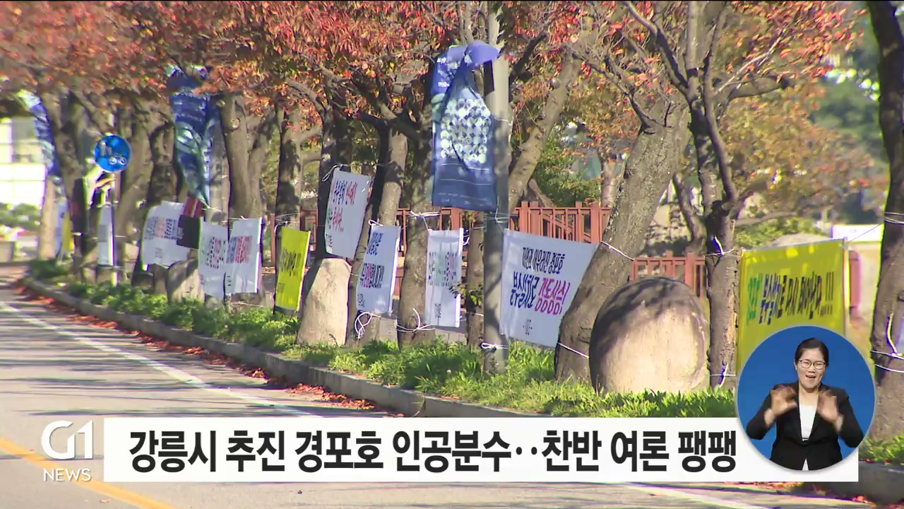 강릉 경포호 일대에는 최근 200여개의 인공분수 설치 찬성 현수막이 설치돼, 인공분수 설치 찬성 입장을 주장하고 있습니다.