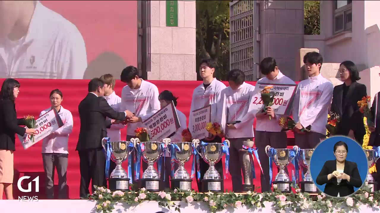 경남에서 열린 제105회 전국체전에서 종합순위7위를 기록한 강원 선수단을 위한 환영행사가 어제(31일) 강원자치도청 앞에서 열렸습니다.