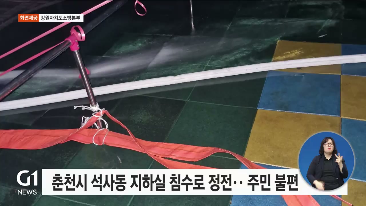 어제(14일) 오후 5시쯤 춘천시 석사동의 한 아파트에서 지하실 침수로 인한 정전이 발생해 주민 720여 세대가 불편을 겪었습니다.