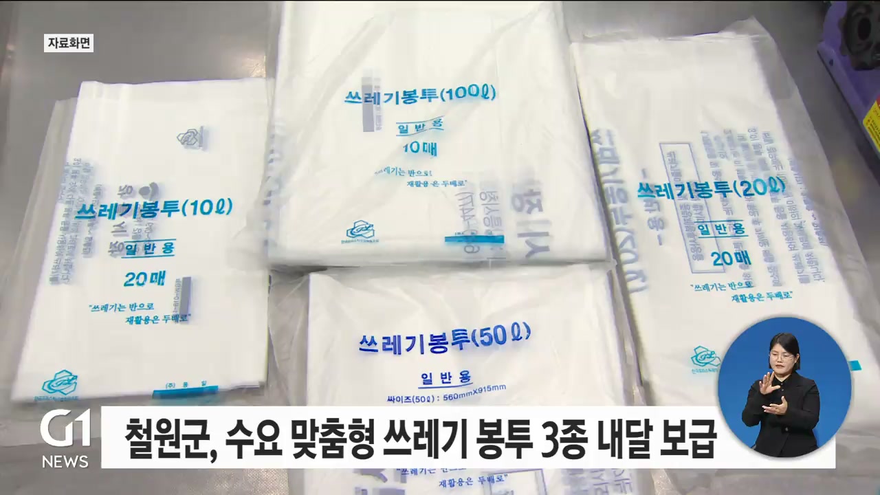 철원군이 내달부터 가연성 쓰레기봉투 75리터짜리와 음식물류 폐기물 봉투 1리터짜리, 불연성 폐기물 전용 특수 마대 20리터짜리를 신규 보급합니다.[앵커]