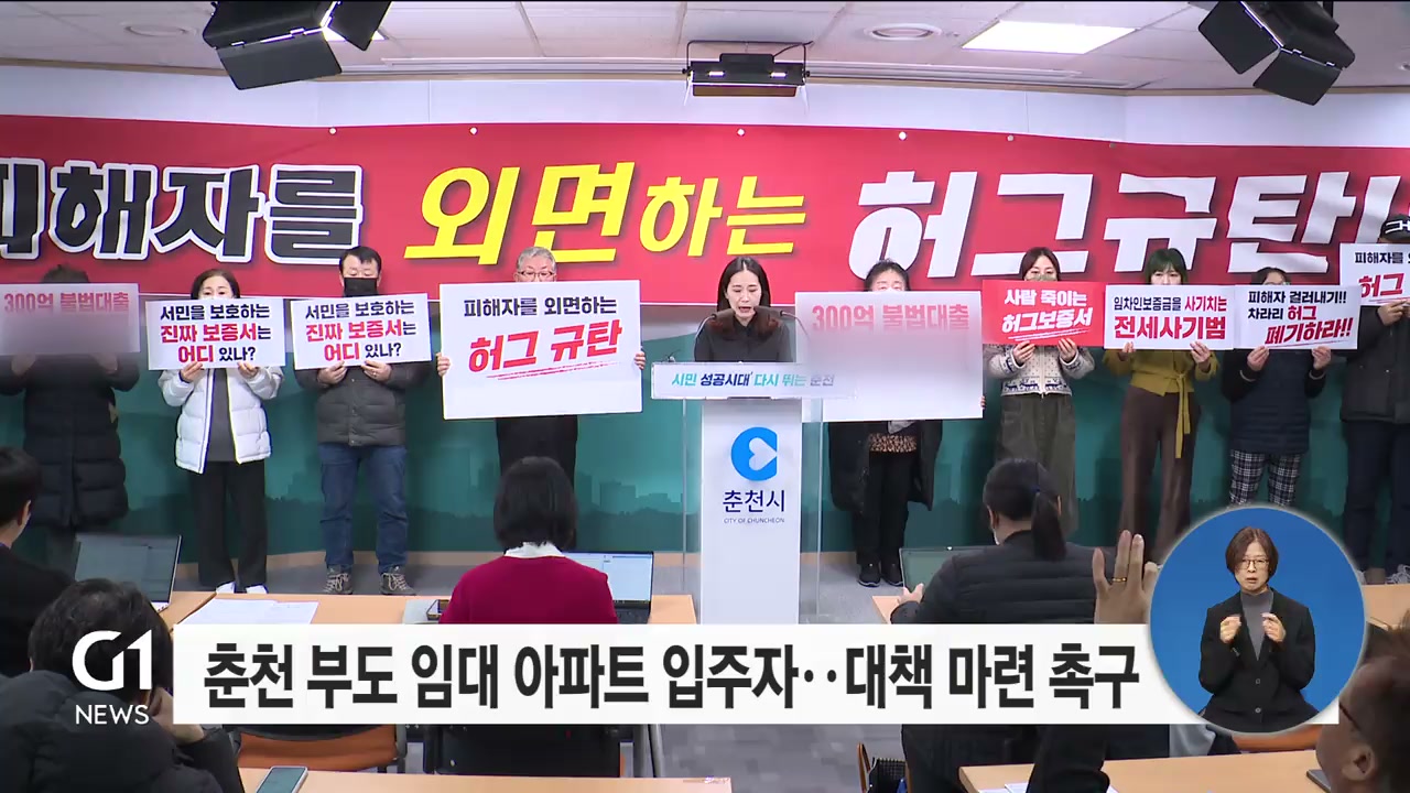 최근 시공사 부도로 임대보증금 반환에 차질을 빚고 있는 춘천 민간 임대아파트 입주 예정자들이 기자회견을 열고, 관계 기관에 사태해결을 촉구했습니다.