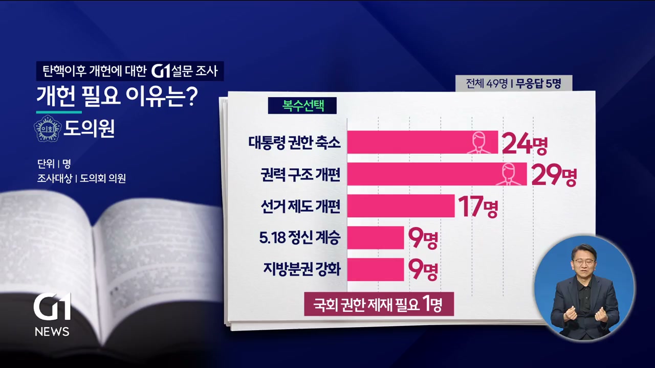 "도의원 49명 중 무응답 5명을 제외한 44명의의원들도 대부분 도내 국회의원들과 비슷한 의견을 보였습니다."