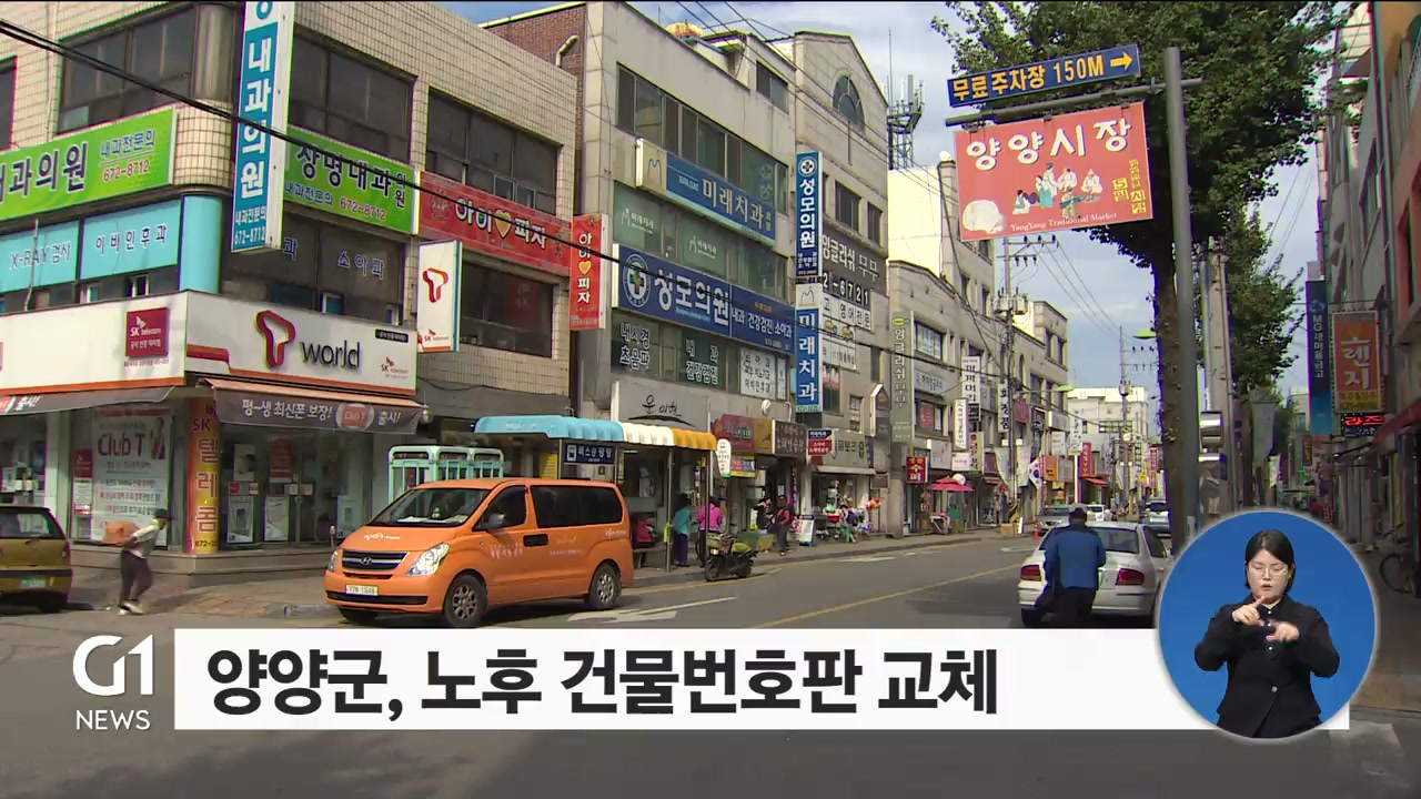양양군이 도시 미관 개선을 위해 노후 건물 번호판을 교체합니다.