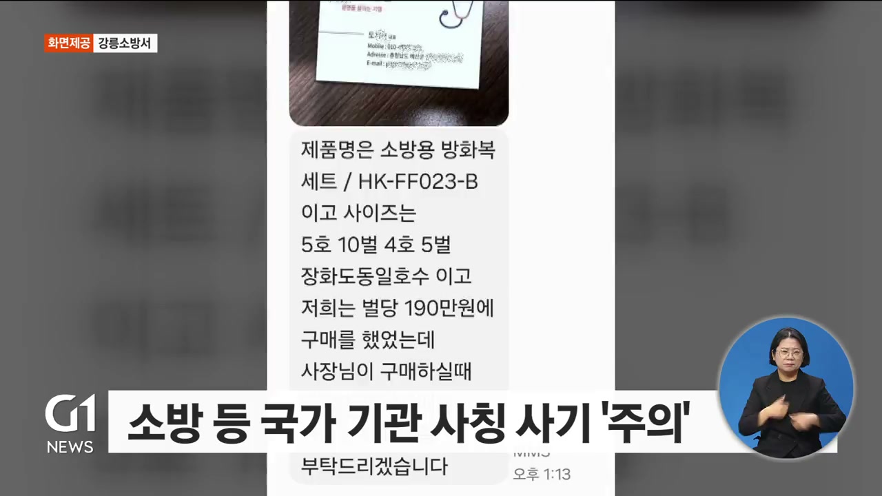 강릉소방서에 따르면 지난 9일 소방서를 사칭한 일당이 한 생활용품점에 3천만 원 상당의 소방 피복 대리 구매 요청을 시도했습니다.