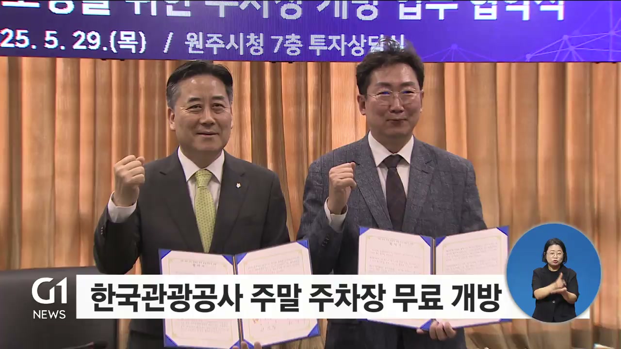 한국관광공사와 원주시는 어제(29일) 시청 투자상담실에서 주말 주차장 무료 개방을 위한 업무 협약을 맺고, 반곡~금대 지구 관광 활성화에 상호 협력하기로 했습니다.