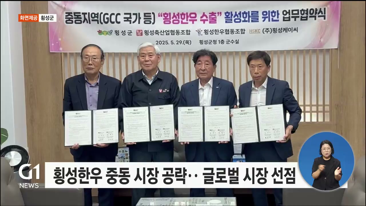 횡성군은 어제(29일) 횡성축협과 횡성한우협동조합, 국제 할랄 도축장 인증을 받은 기업인 횡성케이씨와 함께 중동시장 수출 활성화를 위한 업무 협약을 체결했습니다.