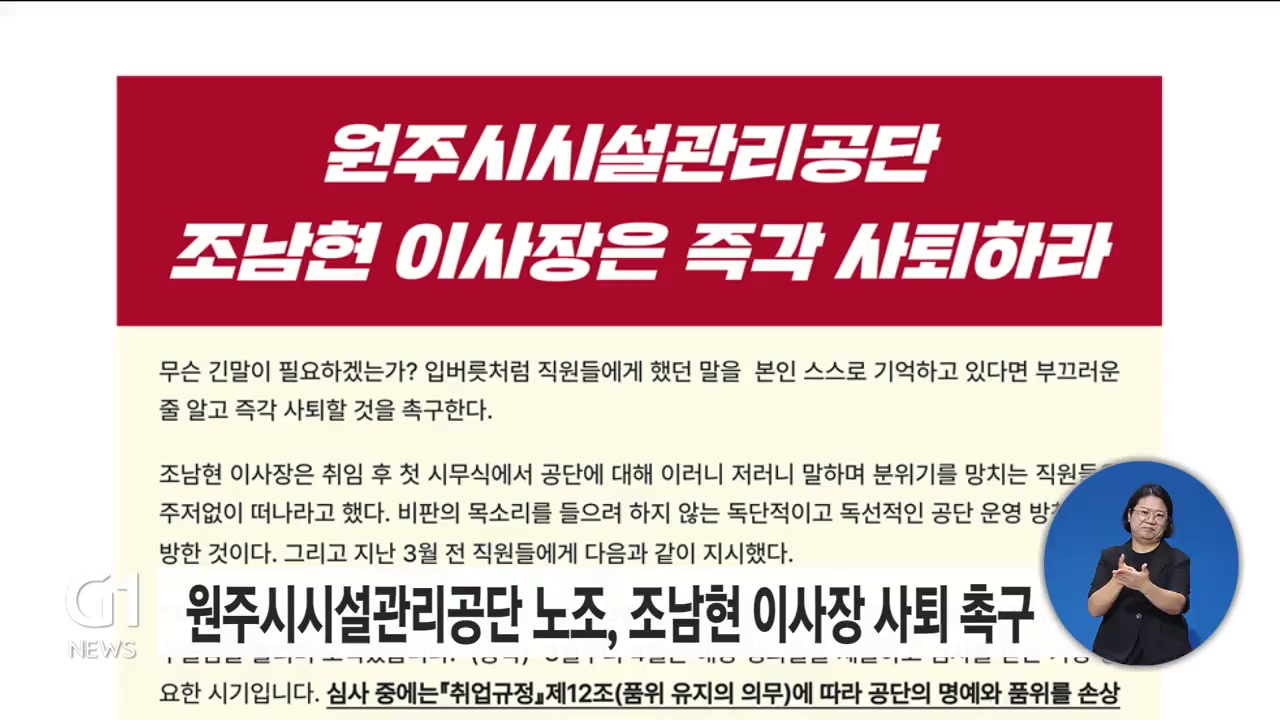 원주시시설관리공단 노조가 조남현 이사장의 사퇴를 촉구하고 나섰습니다.