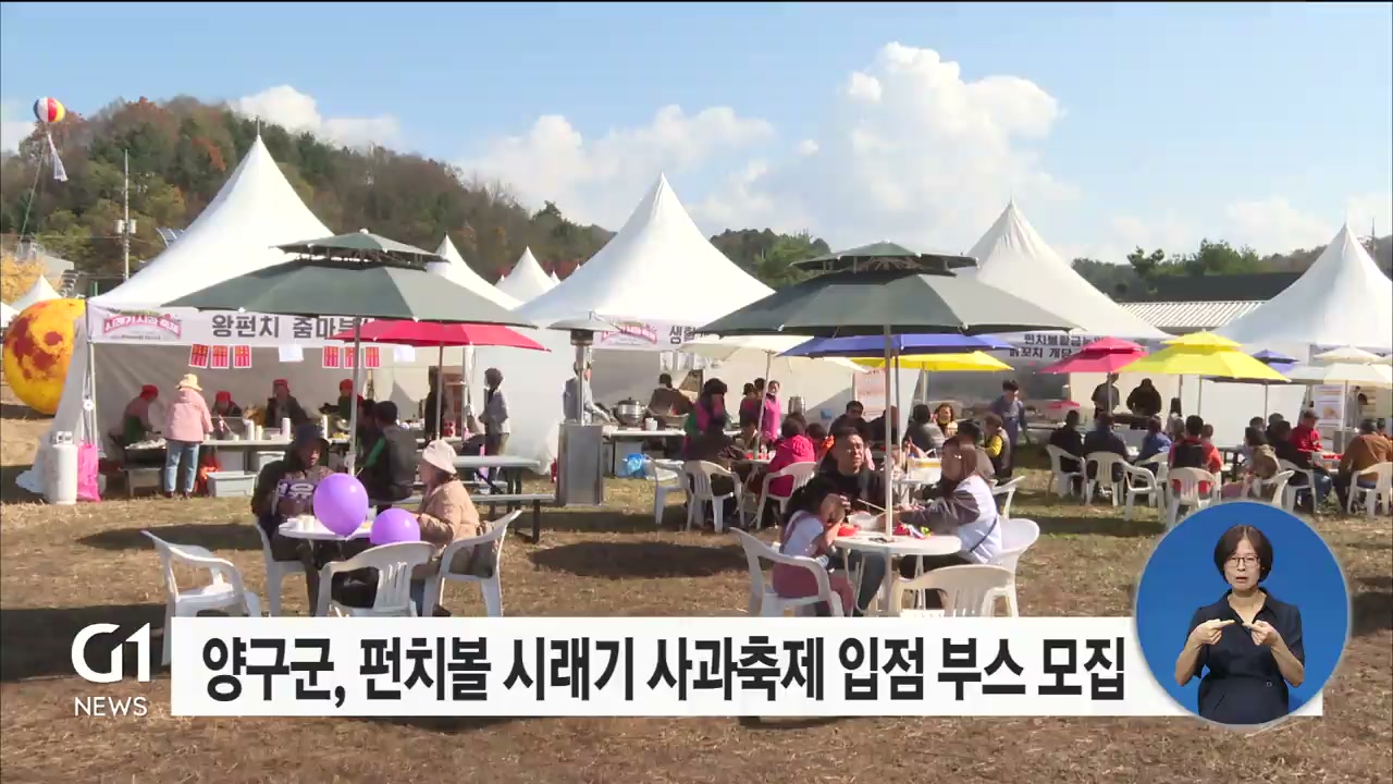 양구군이 다음달 31일부터 11월 2일까지 열리는 '양구 펀치볼 시래기 사과축제'에 입점할 부스를 공개 모집합니다.