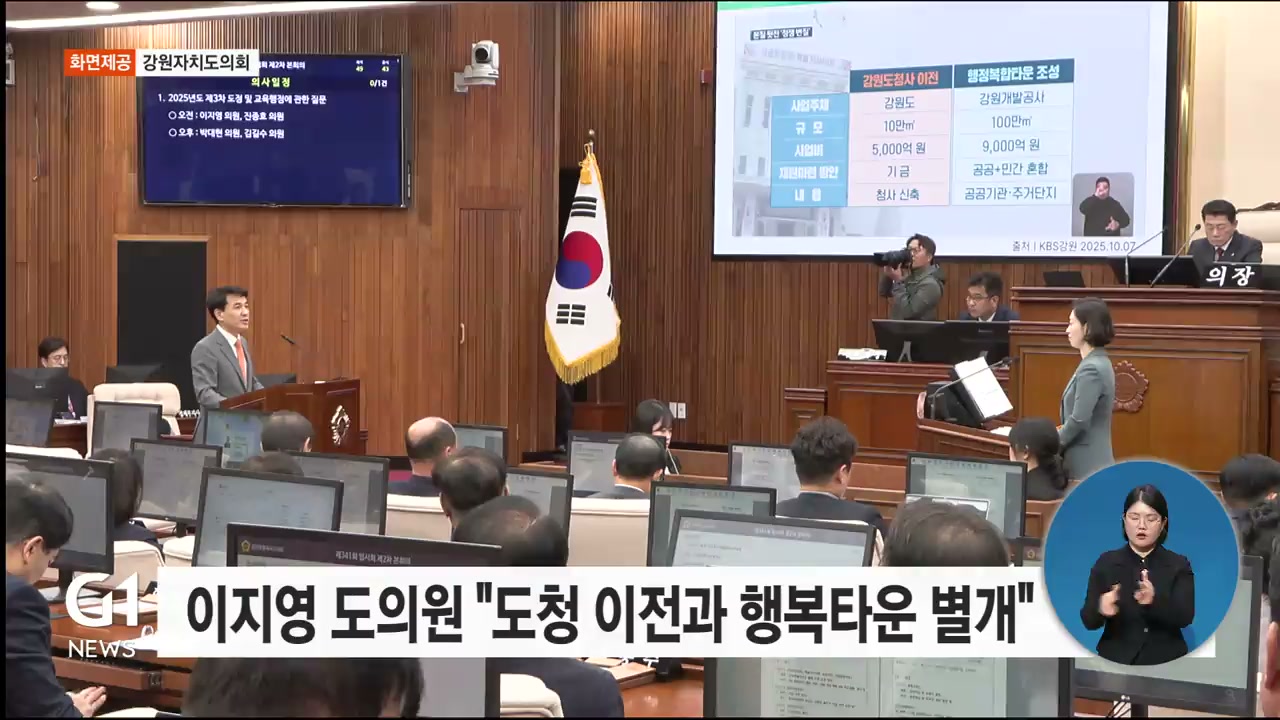 이지영 도의원이 어제(20일) 강원자치도의회 본회의 도정질문에서 행정복합타운 건설 문제를 지적했습니다.