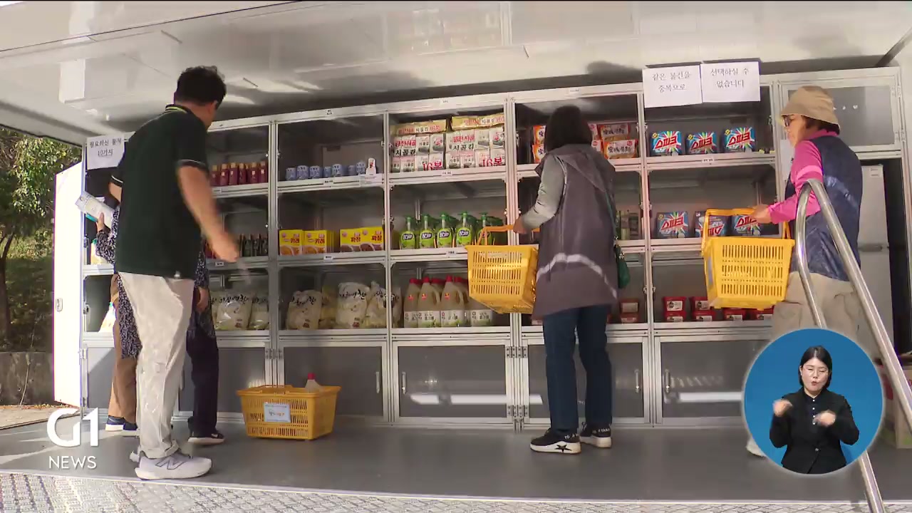 "3.5톤 트럭을 개조해 만든 이동식푸드마켓입니다. 마치 작은 마트를 옮겨 놓은 듯한데요. 이렇게 바구니를 들고 진열돼 있는 물품 중 원하는 물품을 골라 담으면 됩니다."