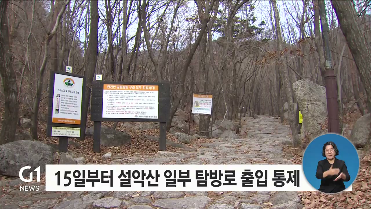 국립공원공단 설악산국립공원사무소는 오는 15일부터 다음달(12월) 15일까지 설악산 일부 탐방로의 출입을 통제한다고 밝혔습니다.